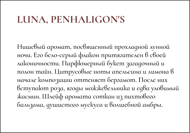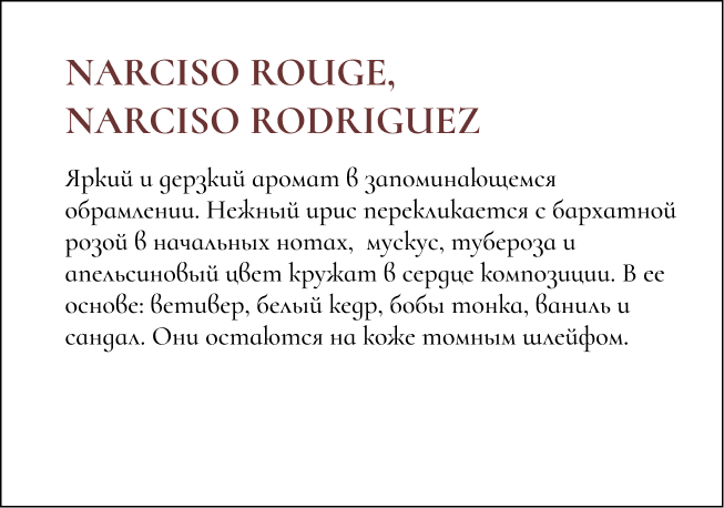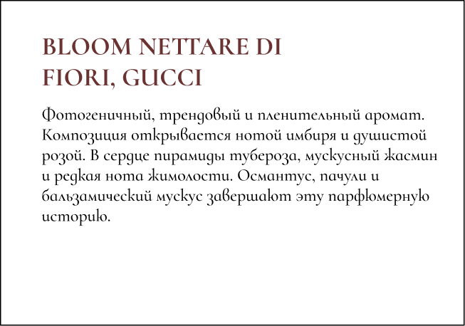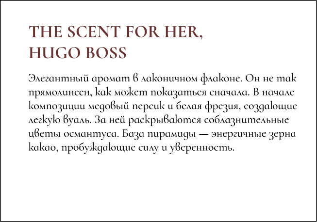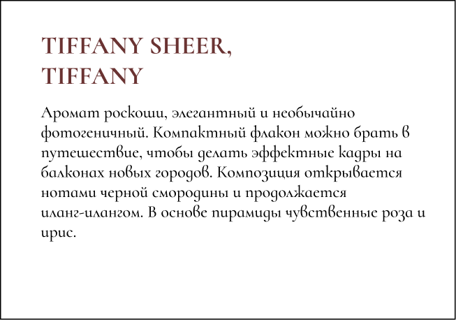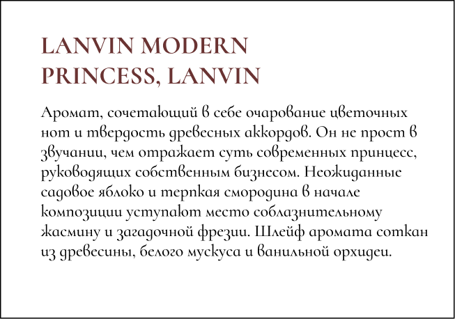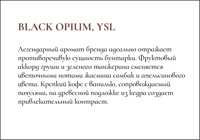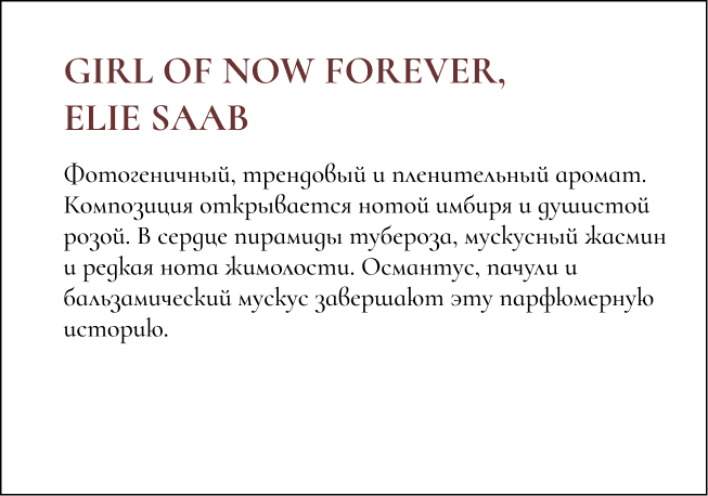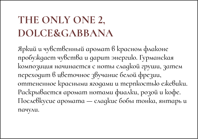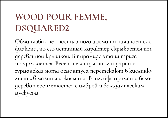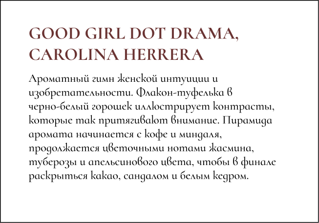Ароматный гимн женской интуиции и изобретательности. Флакон-туфелька в черно-белый горошек иллюстрирует контрасты, которые так притягивают внимание. Пирамида аромата начинается с кофе и миндаля, продолжается цветочными нотами жасмина, туберозы и апельсинового цвета, чтобы в финале раскрыться какао, сандалом и белым кедром.